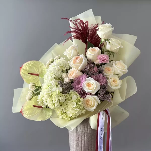 Возможно увеличение/уменьшение наполнения букета при сохранении цветовой гаммы и стилистики